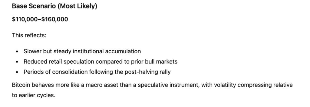 ChatGPT 的展望也反映了比特币市场日益成熟的趋势。与之前的周期相比,散户投机活动有所减少,波动性有所缓解,与更广泛风险资产的相关性有所增强,这表明到 2026 年,比特币将更像一种对宏观经济敏感的数字商品,从而限制其价格的极端波动。