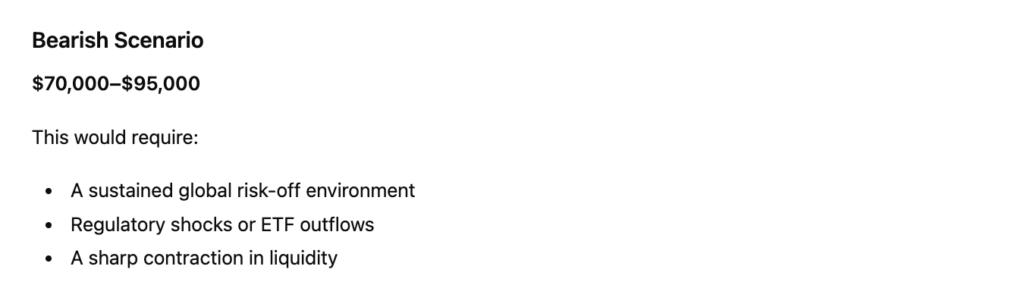 另一方面,ChatGPT 预测比特币价格可能跌至 7 万美元至 9.5 万美元区间,这构成了一种悲观情景。这种情况很可能是由持续的避险宏观环境、监管动荡或大量 ETF 资金外流等因素导致的。即便如此,该模型也表明比特币价格可能仍远高于 ETF 发行前和减半前的价格水平,这表明其结构性支撑已经增强。