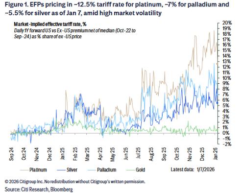 截至1月7日(UTC+8),EFPs定价显示市场预期铂金关税税率约为12.5%,钯金约7%,白银约5.5%。这些隐含税率在高度波动中反映了市场的不确定性。