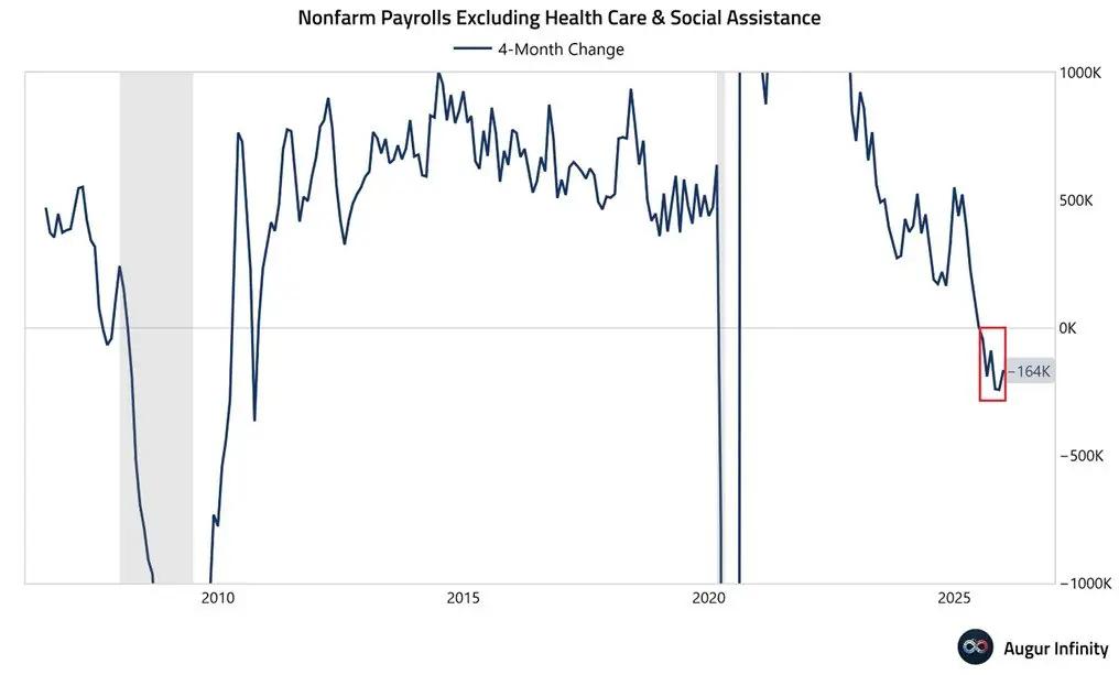 过去四个月,不包括医疗保健和社会援助行业的非农就业人数减少了16.4万人。这是自2020年疫情冲击以来,除这些行业外,非农就业人数降幅最大的一次。尽管同期总就业人数仍小幅增长了4.1万人,但这一增长过于集中,掩盖了经济其他领域更广泛的就业岗位流失。