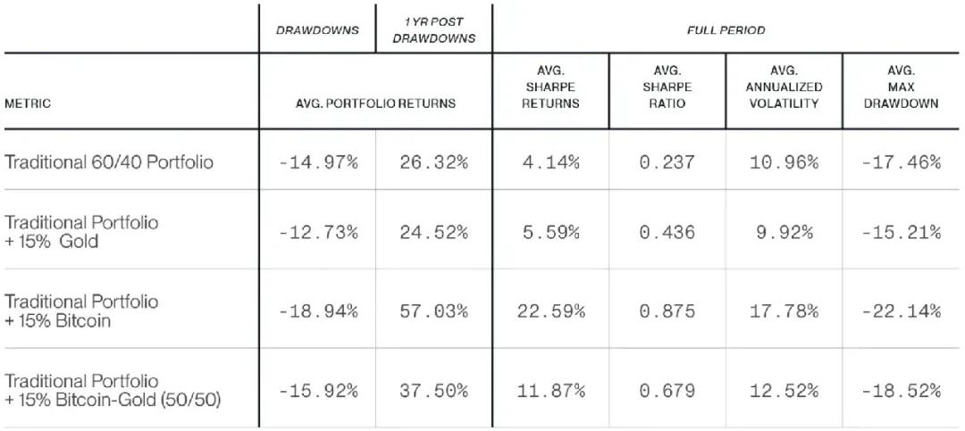 更实际的方法是考虑整个周期内的表现。而在这里,数据是结论性的:从历史上看,同时加入黄金和比特币,能在缓冲市场回调时的冲击和提高复苏期的回报之间提供最佳平衡。从统计角度来表述,一个同时包含黄金和比特币的投资组合,其夏普比率为 0.679,几乎是传统投资组合夏普比率 0.237 的三倍,也远高于仅包含黄金(不含比特币)的投资组合的 0.436。虽然仅包含比特币(不含黄金)的投资组合夏普比率最高(0.875),但其波动性也显著高于黄金 / 比特币组合。