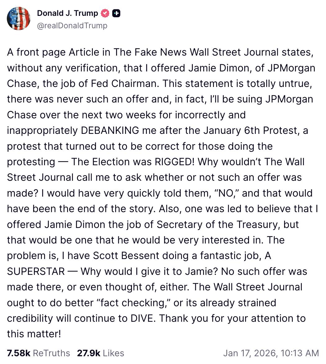 据彭博社周四报道,特朗普已在Miami-Dade County州法院提交诉状,要求JPMorgan及其首席执行官Jamie Dimon赔偿50亿美元。该诉状在发布时尚未在法院公开档案中显示。