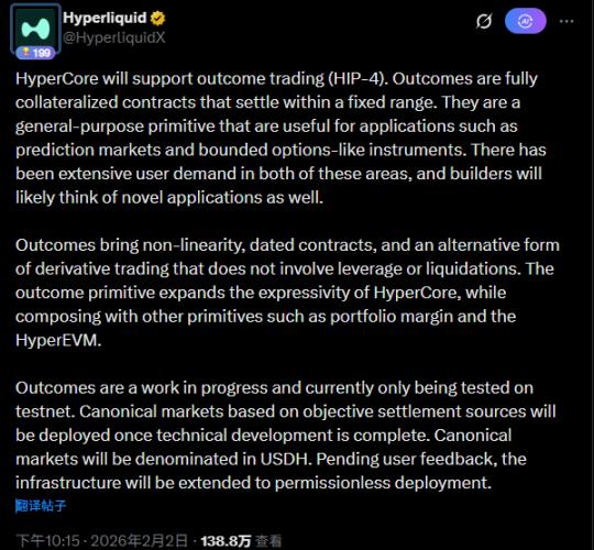 2 月 2 日,Hyperliquid 宣布 HIP-4 提案已于 2 月 2 日上线测试网,该提案旨在通过引入「结果交易(Outcome Trading)」构建预测市场基础设施。此外,2026 年 1 月末至 2 月初,加密货币市场走势趋弱,比特币价格一度跌破 75,000 美元关口,大盘普遍回调。Hyperliquid 原生代币 HYPE 却逆势上涨,过去一周累计涨幅超过 40%。