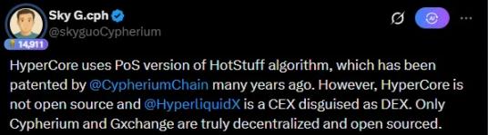然而,在业务版图扩张之际,Hyperliquid 遭遇了来自同行的技术侵权指控。2 月 2 日,RWA 公链项目 Cypherium 的创始人 Sky Guo 在社交媒体上公开指控 Hyperliquid 侵犯其专利技术。Sky Guo 认为,Hyperliquid 的底层共识引擎 HyperCore 使用了受专利保护的 PoS 版 HotStuff 优化算法,并要求其停止侵权行为。