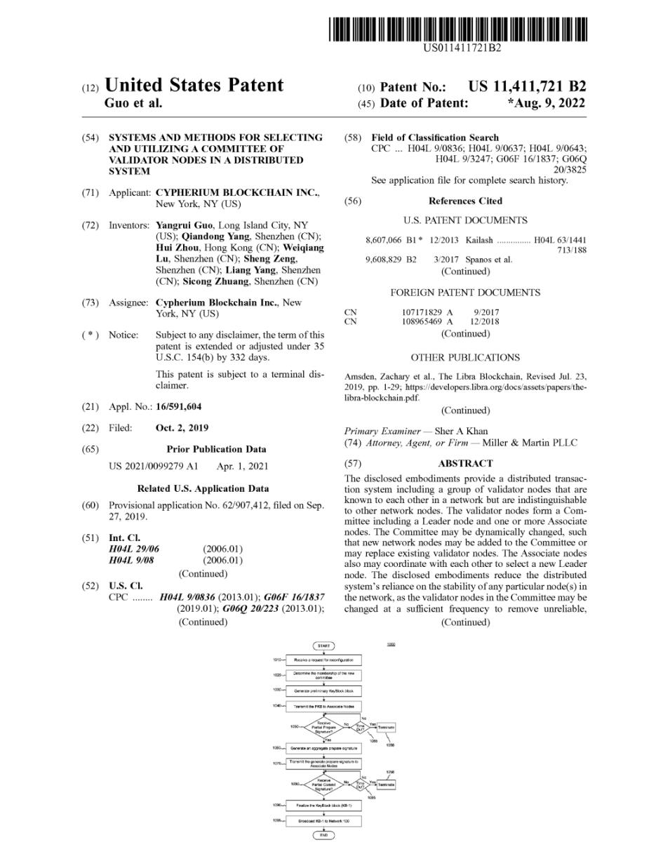 此次纠纷的核心指向一份由美国专利商标局(USPTO)于 2022 年 8 月 9 日颁发的正式专利,编号为 US 11,411,721 B2。该专利的受让人为 Cypherium Blockchain Inc.,其标题为「Systems and methods for selecting and utilizing a committee of validator nodes in a distributed system(在分布式系统中选择和利用验证者节点委员会的系统和方法)」。