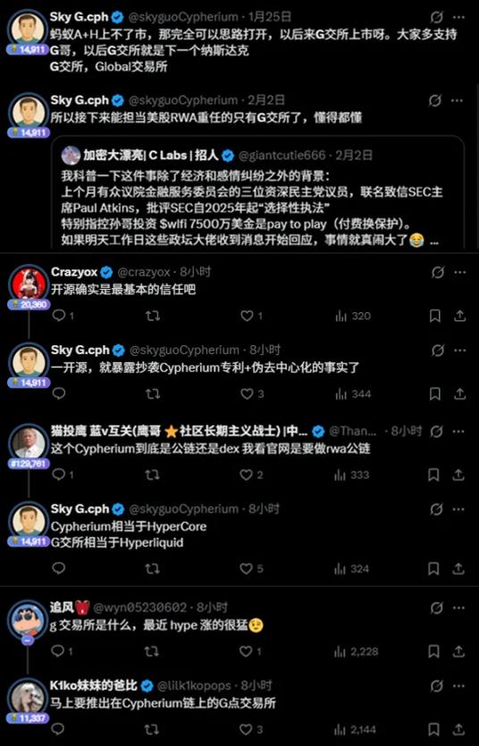 在社交平台上,部分 KOL 对此次维权行动表示了声援,但相关帖文的评论区却出现关于「G 交所(G-Exchange)」的疑似推广内容。「G 交所」是 Cypherium 生态内即将上线的新项目,这种技术指控与新项目预热在时间线上的巧合,使得这一系列维权动作疑似其为新业务造势的碰瓷营销。