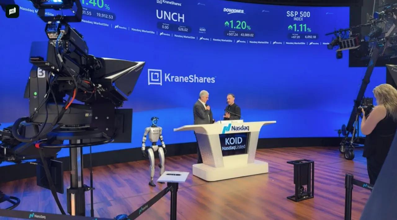 值得一提的是,在 Nasdaq 举办、由 KraneShares 推出的 ETF 挂牌仪式上,OpenMind 的人形机器人搭载 OM1 操作系统亮相现场,并参与了上市启动环节。