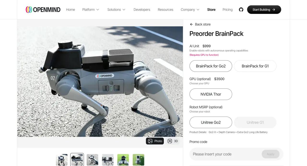 BrainPack去年11 月官宣发布了具体的机器狗产品,根据官方预售页面来看,定金999美元,它支持捆绑 Unitree 机器人套装,首批完整交付预计在 2026 年 Q1 左右,目前虽处于预购阶段,已有开发者和实验室收到测试版或早期交付。