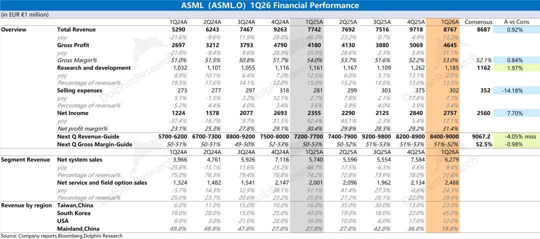 1、收入&毛利率:a)本季度收入87.7亿欧元,同比增长13%,符合市场预期(87亿欧元),其中公司本季度的增长,主要来自于韩国客户对EUV的需求和服务收入的增长。b)本季度毛利率53%,达到公司指引区间上限(51-53%),主要毛利率相对较高的服务收入占比提升的带动。