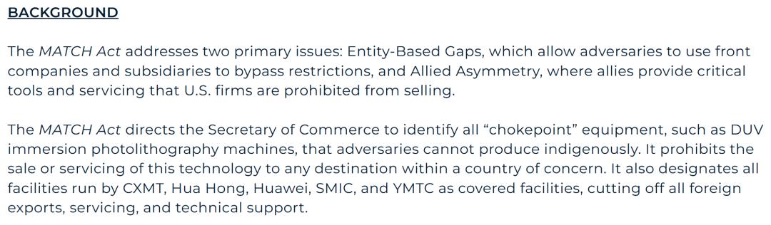 2026年4月2日美国国会提出了MATCH法案,核心目标是正式化并加速美国与荷兰、日本的先进半导体设备出口管制协同,封堵现有管控漏洞。