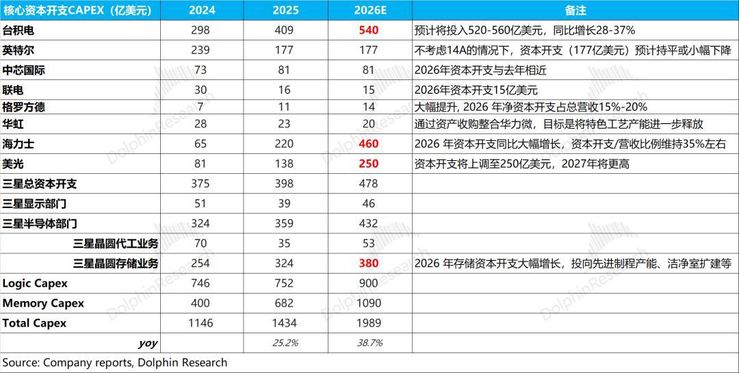 综合核心厂商资本开支的展望,海豚君预估2026年逻辑类厂商的资本开支增速有望达到20%左右;而存储类厂商的资本开支增速将接近于60%。下游资本开支的增长,来自于台积电和存储厂商的加大投资,都是本轮AI Capex的主要受益者。