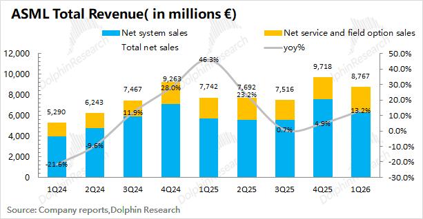 1.2收入端:阿斯麦(ASML)在2026年第一季度实现营收87.7亿欧元,同比增长13%,符合市场预期(87亿欧元)。收入同比增长,主要来自于韩国存储类客户对EUV的需求和服务业务的带动。