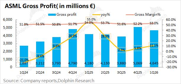 1.3毛利及毛利率:阿斯麦(ASML)在2026年第一季度实现毛利46.5亿欧元,同比增长11%。其中毛利率方面,公司本季度毛利率53%,环比提升0.8pct,达到公司指引区间上限(51-53%),主要是受毛利率相对较高的服务收入占比提升的带动。