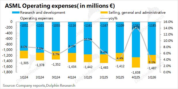 1.4净利润端:阿斯麦(ASML)在2026年第一季度净利润为27.6亿欧元,同比增长17%,其中公司本季度净利率为31%。其中公司本季度经营费用端有所增长,经营费用率维持在17%左右。