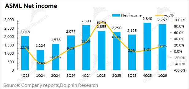 从公司指引来看,虽然一季度和二季度的表现相对平淡,但下半年有望迎来明显增长。阿斯麦ASML当前受益于AI Capex带动的资本开支上行周期,而在2027年及之后还有“High-NA”产品周期的接棒。