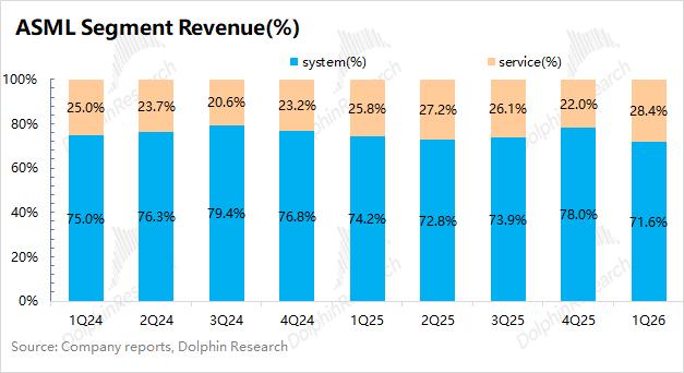 阿斯麦(ASML)的业务由系统销售收入和服务收入两部分构成。公司最核心的光刻系统销售收入占比在7-8成,服务收入是本季度增长的主要动力。