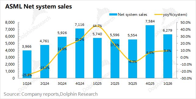 阿斯麦(ASML)的系统销售收入在2026年第一季度实现62.8亿欧元,同比增长9%,本季度主要来自于对韩国客户EUV设备出货的增加。