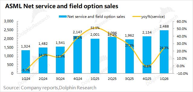 阿斯麦(ASML)的服务收入在2026年第一季度实现25亿欧元,同比增长24%(UTC+8)。阿斯麦的服务收入,主要包括设备维护等项目,受行业周期影响较小。