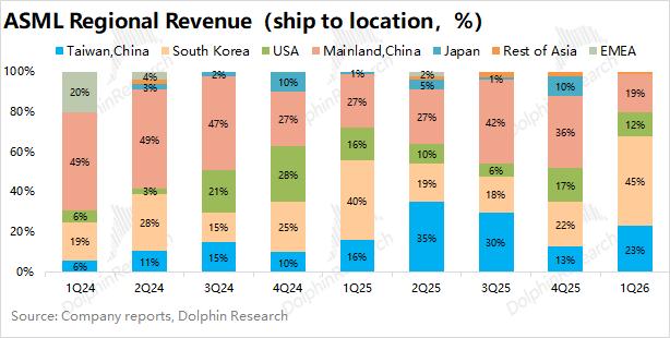 阿斯麦ASML披露的地区收入,是以“ship to location”的口径。因而台积电将2026年资本开支提升至520-560亿美元,大幅增加的资本开支不一定全部体现在中国台湾地区的收入中,其中一部分也会在台积电美国工厂中,可能会带动中国台湾地区和美国地区两项占比的回升。