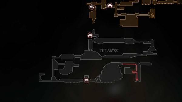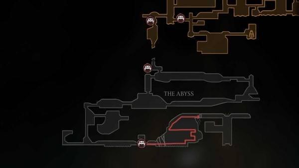 进入深渊区域后,从南边的长椅出发,往右进入全是虚空怪的区域,一直往右走,直到遇见能往上走的墙壁。