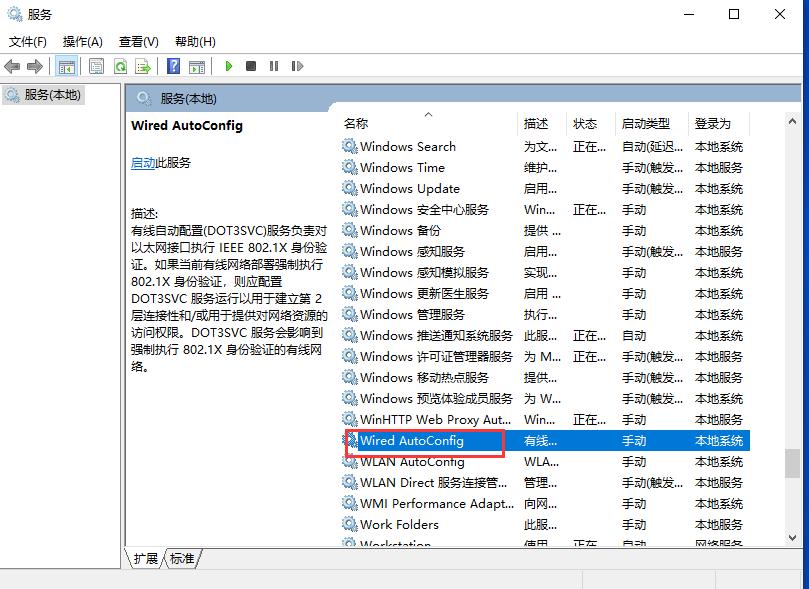 2、您需找到名为“Wired AutoConfig”的服务,如下图所示。