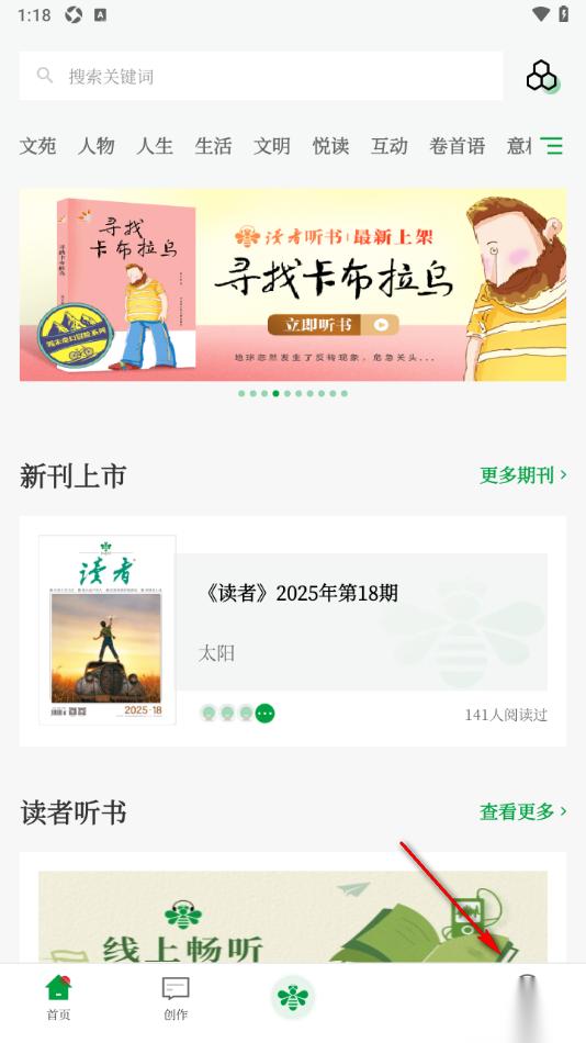 1.当我们将手机上的读者app点击打开之后,在页面右下角的位置直接将我的选项点击打开。