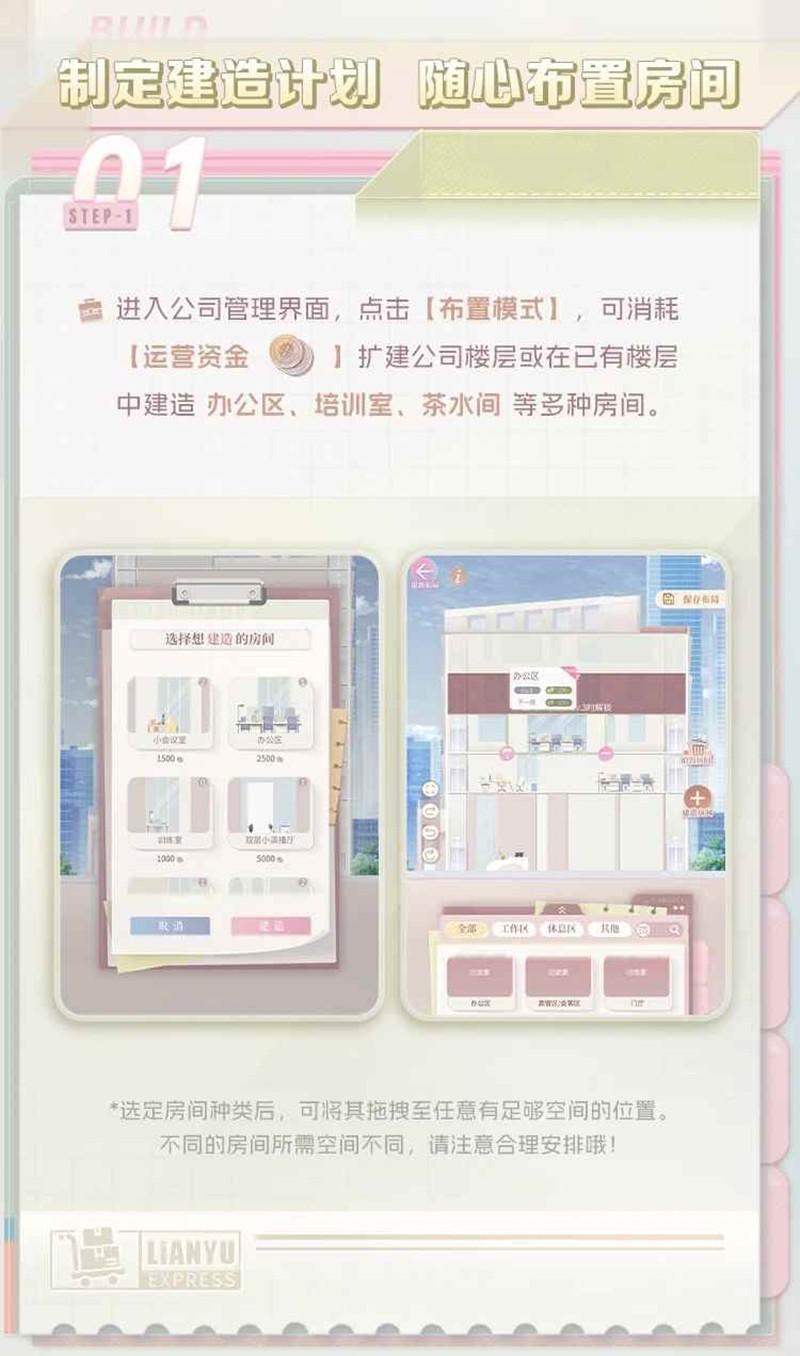 1.进入公司布置模式后,可消耗【运营资金】扩建楼层,或在已有楼层中建造办公区、培训室、茶水间等多种房间。