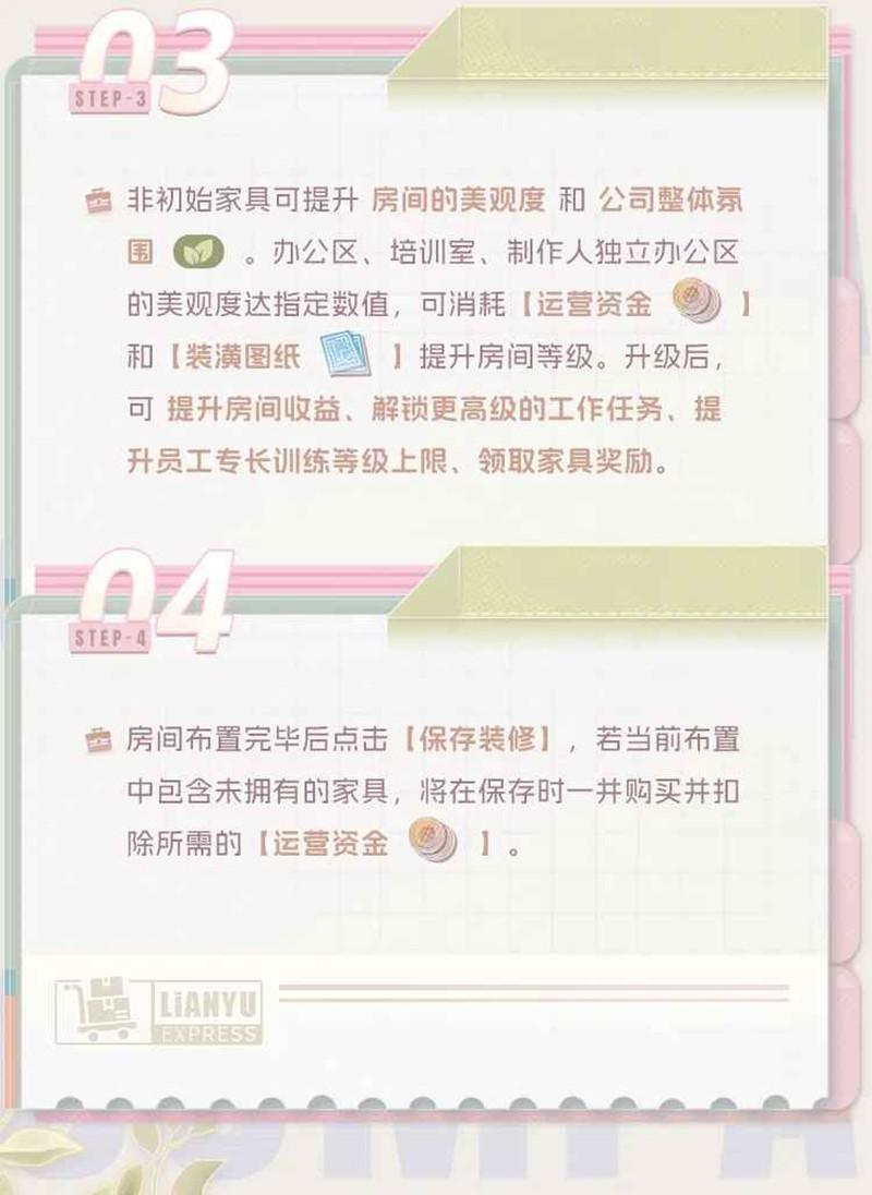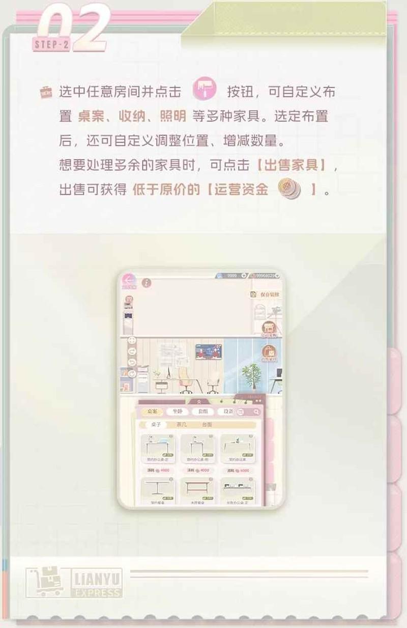 2.建造房间后,随心布置多种家具。非初始家具需消耗【运营资金】获得,但可提升房间美观度和公司整体氛围。