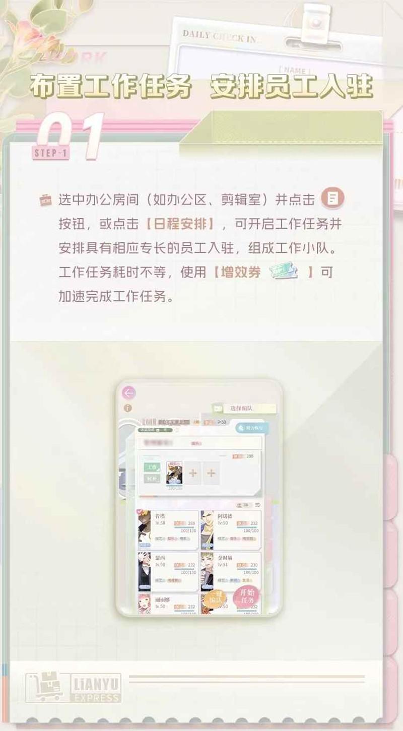 1.选择心仪的角色并开启专属项目,完成系列工作任务,可领取【运营资金】和【增效券、心绪之花、心绪之石、初识心愿、金币】奖励。
