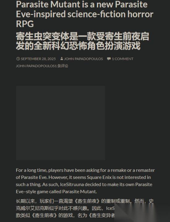 国外媒体DSO Gaming近期发布了一篇关于本作的详细介绍,文中指出这款游戏在风格和玩法上令人联想到Square Enix旗下的经典系列《寄生前夜》(Parasite Eve-style game)。
