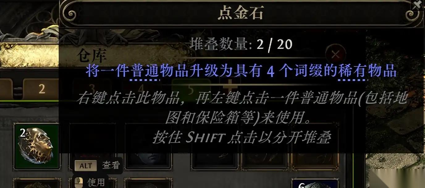 顾名思义就是点金,可以将一件普通(白装) 物品直接升级为稀有(黄装) 物品(带有数条随机词缀)。开图必备(将普通地图点成稀有地图以获得更多收益),也是快速获取一件可用黄装的最直接方式。