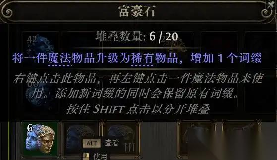 - 富豪石是将一件魔法物品(蓝装) 升级为稀有物品(黄装) 并新增一条词缀,也是非常看脸的。