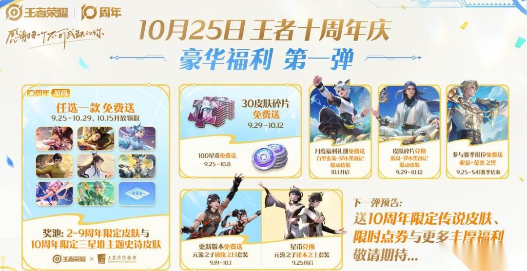 本次庆典将在10月25日正式开启。首波福利中最引人注目的就是史诗限定皮肤免费送。期间参与,就可以从2~9周年的限定皮肤中任选一款,如果之前已收集完毕,还可以免费获得入手十周年史诗限定皮,并且是“三星堆主题”的。