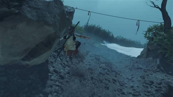此处的跑酷需要利用下坡的坡度和钩爪抓住上面绑着红绳的绳索上移动。