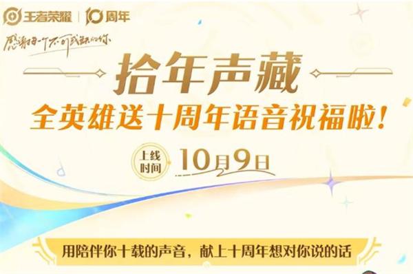 为庆祝《王者荣耀》十周年,官方推出特别活动“拾年声藏”,让玩家以最具纪念意义的方式重温英雄的经典声音。本次活动于今日正式开启,全英雄语音祝福限时解锁,老玩家们可借此聆听熟悉的声音,共同回顾十年征程。