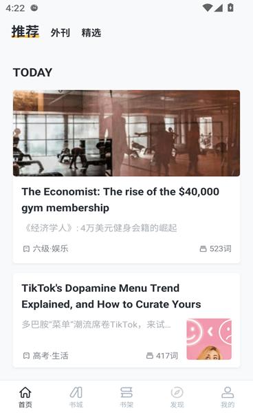 懒人英语阅读app怎么用,首先在本站下载安装懒人英语阅读app,第一次打开要建立阅读档案,随后进入首页,首页是最新给你推荐的文刊,你也可以在书城搜查想看的书名,然后把它们加入书架,以后就不用想看的时候重新搜索,没有指定的书名也可以在榜单中挑选热门的阅读。