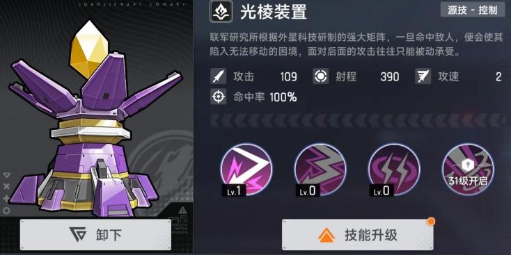 源能类防御塔算是后期的主力输出,光棱装置绝对是这里面的顶流,它攻速快伤害高,一技能能麻痹敌人,二技能还能加伤害,1级天赋带的攻击折射效果,让它打群怪也不费劲,中后期关卡里精英怪大多是重甲,光棱装置打重甲伤害很稳定,既能当主力输出扛伤害又能偶尔控一下敌人,不管是单放还是扎堆摆,效果都特别好几乎是每个玩家必带的塔。