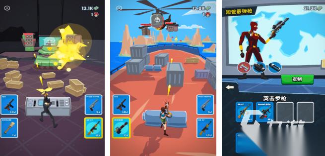 子弹特工最有意思的就是能利用子弹反弹攻击敌人,比如敌人躲在箱子后面,直接开枪打不到,这时候就得找好角度,让子弹碰到墙壁反弹过去正好击中敌人,战斗的时候场景里会有很多可利用的东西,除了单人闯关还能玩生存模式,一波波敌人不断涌过来,得一边躲子弹一边反击,撑得时间越长给的奖励越多。