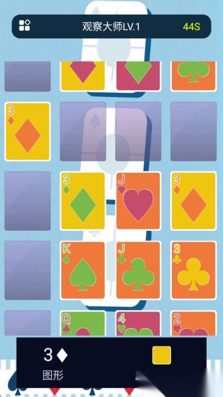 一个专门锻炼观察力和记忆力的休闲益智手机游戏,游戏玩法非常简单,就是卡牌配对消除,展示环节记住卡牌位置和图案,然后翻牌找出相同两张完成消除。游戏难度会从4张牌慢慢加到16张牌,而且展示环节的时间还会缩短,背景也会增加动态元素干扰玩家进行记忆,卡牌的正面有多种主题可以选择,从扑克到日常物品、动物图标都有。