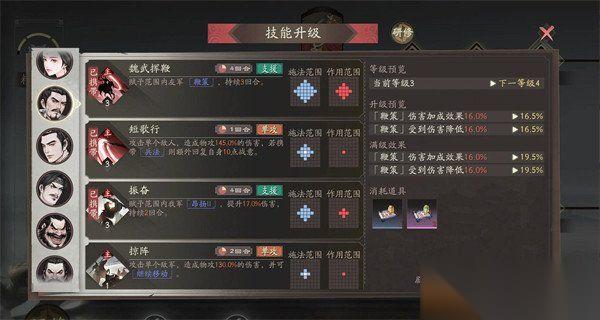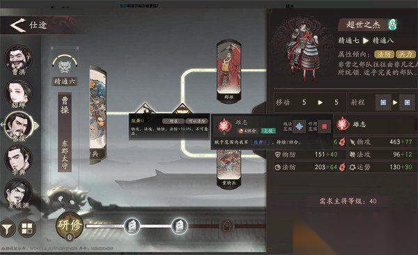 我们搞定阵容之后就要注意一下技能加点了,推荐大家先点群雄线的魏武挥鞭,他能造成范围伤害附加16%增伤和减伤,是开荒期核心buff,然后就点出天下归心(重骑兵线),唯一光环技能提升菱形2格内战法伤害10%。仕途的话可以先把重骑兵线解锁到40级拿天下归心,再补群雄线魏武挥鞭,最后点雄志(超世之杰)弥补天赋兵法持续时间不足,这个技能加全队10%攻防,能和天赋叠加用。