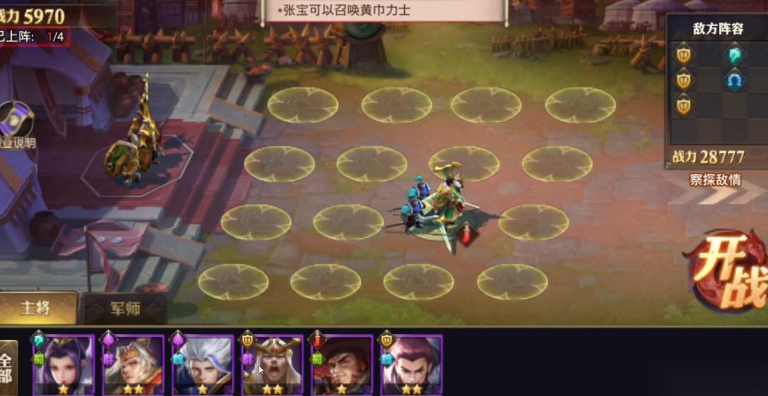 召唤篇是演武场中考察黄巾流派基础操作的关卡,核心在于合理搭配召唤型武将并掌握站位技巧。该关卡需要选择张梁、周仓、张角、袁术四名黄巾阵营武将,其中张梁和袁术必须放置在前排上方两列,用于阻挡敌方骑兵突袭后排。张角的召唤技能和黄巾力士的持续产出是维持战线的关键,周仓则提供前排输出支援。召唤流的优势在于通过源源不断的黄巾单位消耗敌方兵力,同时为军师技能创造释放空间。