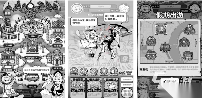 这是款基于圣经神话故事开发的天使主题游戏,黑白背景张弛有度且拥有角色扮演的性质,大家会扮演造型可爱的小天使进入天堂各个部门中互动,资料部、救赎部等超多特殊的部门等待大家解锁,以天使身份庇佑人的命运也颇有成就感,你也可尝试寻找那些信奉天界的信徒汲取特殊的力量,总的来说这款小清新天使游戏还是挺好玩的。