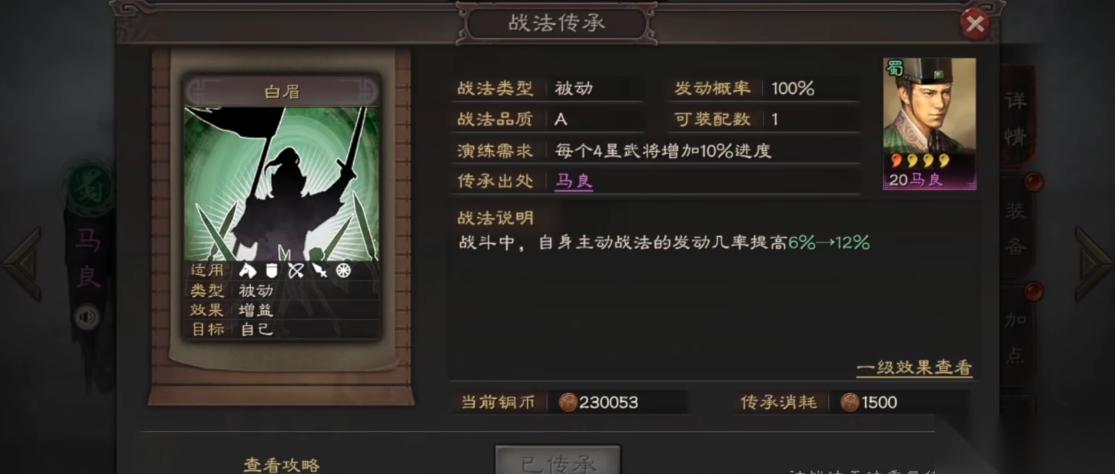 白眉战法是关羽的必备选择,12%的主动战法发动率加成能有效缓解其技能触发难题,而第二个战法槽位推荐搭配横扫千军,该技能不仅能补充群体伤害,还能与威震华夏的控制效果联动触发震慑,形成压制链。若缺乏横扫千军,纵兵劫掠可作为平替方案,虽为单体伤害但同样具备震慑触发机制。