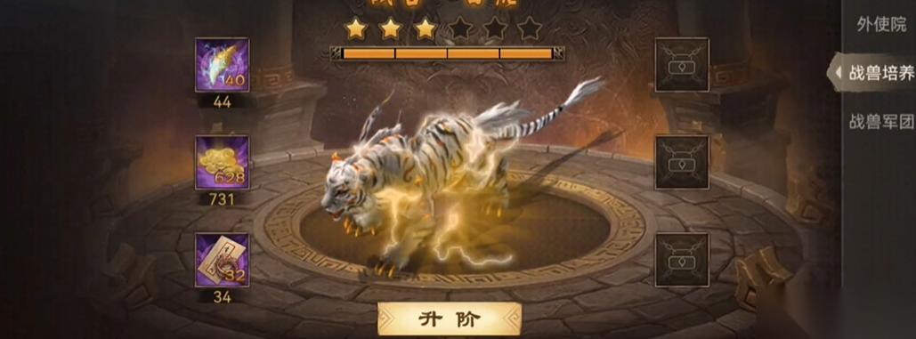快速拿到心仪的战兽,可以从这几个方向入手:通关特定副本解锁系统、参与限时活动攒资源、使用道具直接兑换,以及通过战斗和养成逐步培养。当咱们的主城等级冲到220级,通关董卓副本后,游戏会解锁新外使院功能,这里就是战兽的大本营啦!记得顺手把西域进贡科技研究完,这样就能在战兽馆里正式启动战兽系统了。目前最先开放的是白虎战兽,后续还会更新其他强力伙伴哦。