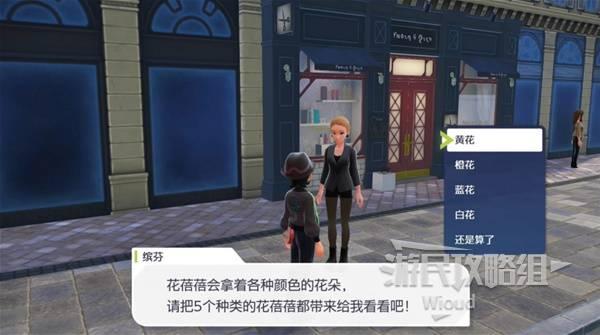 过去和店员对话,得知要找到五种不同颜色的花蓓蓓。