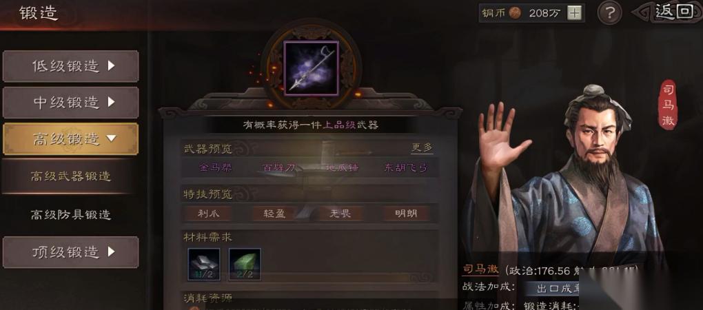 武器的获取主要通过锻造系统,需要消耗铁矿、铜币和材料。锻造时,委任高魅力武将如曹植或步练师,可以提高高阶装备的产出概率。铁匠铺的等级决定了可锻造武器的品质范围,顶级铁匠铺能打造橙色武器并解锁专属特技。部分特定武器需要设计图才能锻造,设计图可通过讨伐贼寇、商贾贸易或寻访获得。锻造出的武器会附加2-3种随机属性,数值也是随机生成,因此反复锻造是获取极品武器的关键。