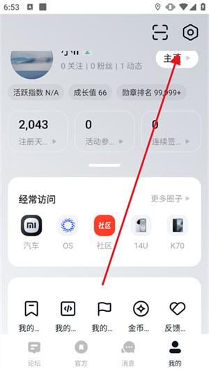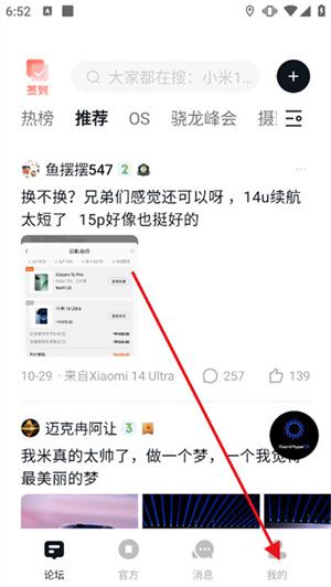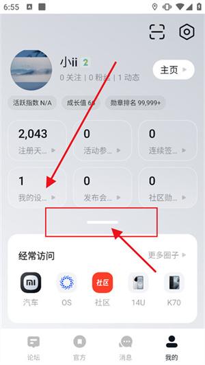小米社区app怎么查看动态,首先,大家可以进入到软件的首页,并找到右下角【我的】页面并继续跳转,接着,找到这个页面中间的横线向下滑动,就能看到设备的选项,如果你想看到自己的发帖信息,点击最上方【主页】,可再次跳转页面。