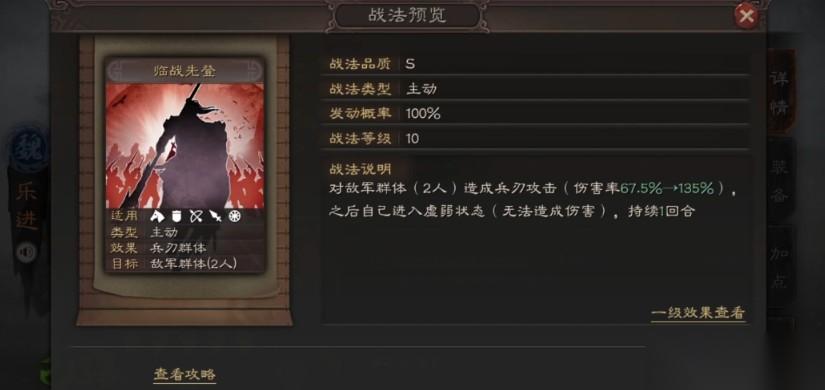 核心战法搭配上,姜维通常携带夺魂挟魄和形机军略,前者能偷取敌方属性强化自身,后者提供稳定的群体伤害。赵云推荐带破阵摧坚和万箭齐发,利用高武力打出破防效果和范围输出。