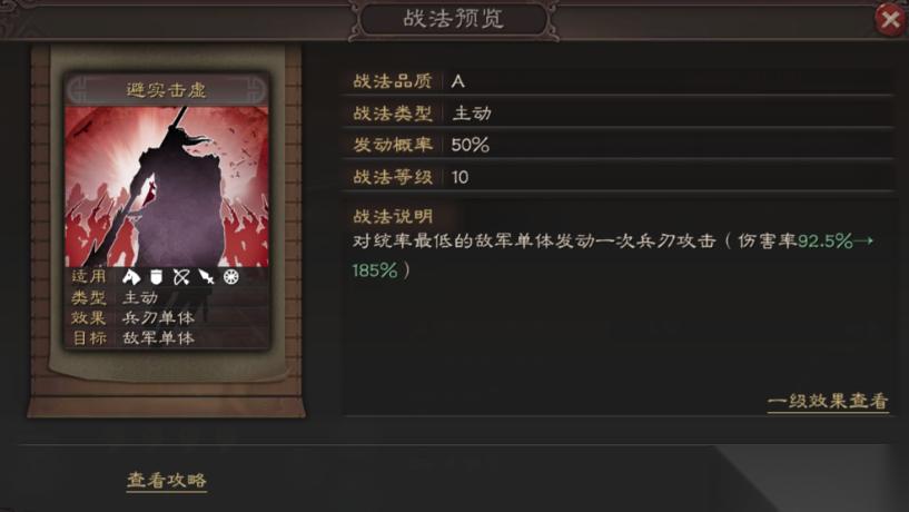 以治击乱对处于缴械或计穷状态的敌人提升12%伤害,与盛气凌敌战法完美契合;避实击虚进一步强化后续回合的输出,而将威提供的暴击概率则能创造意外爆发。这套方案适合桃园盾等偏重控制的阵容,通过刘备、关羽的辅助延长战斗节奏,让张飞的群体伤害持续生效。但需确保队伍具备稳定的控制手段,否则收益会大幅降低。
