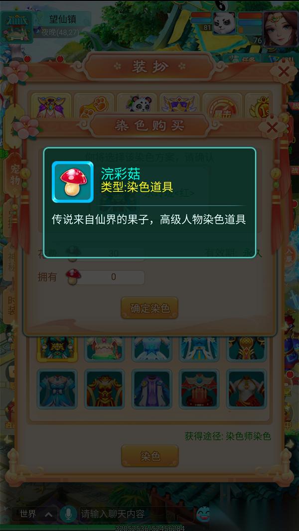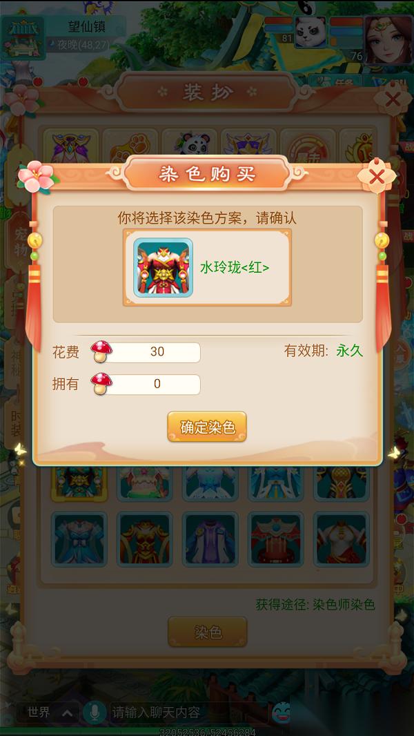 选定心仪的染色方案后,点击下方的“染色”按钮即可完成换装。每次染色需要消耗30个“浣彩菇”,该道具可在集市的“珍宝阁”中直接购买,也可在染色界面一键快捷购入,轻松又方便。